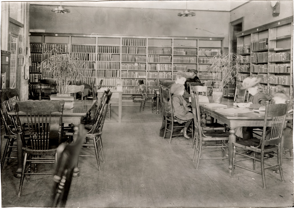 View of women and children reading at a table in the Utley Branch Library, Detroit Public Library. Bookshelves in background. Typed on back: "Detroit Public Library, old Utley Branch." Handwritten on back: "North Woodward I Branch, building, storefront on Woodward Avenue, south of West Grand Blvd., interior view. Photo taken in 1905."