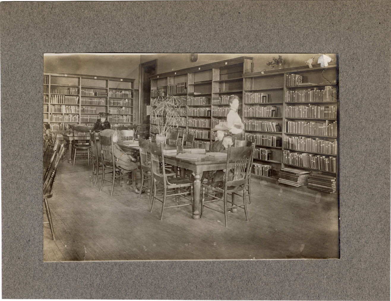 View of women and children reading at a table in the Utley Branch Library, Detroit Public Library. Librarian and bookshelves in background. Handwritten on back: "Utley Branch. Branch #1 (Utley) interior of storefront of Woodward Ave., branch home 1905-13."