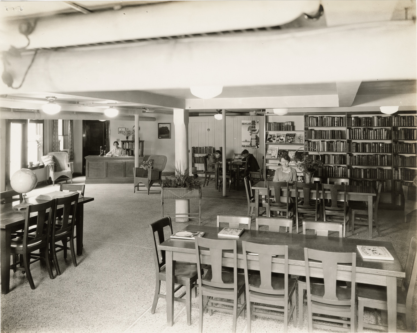 Interior view of the Flat Rock Center, Wayne County Service, Detroit Public Library housed in the basement of the State Savings Bank. Room is furnished with tables, chairs, desk and bookshelves. Stamped on back: "The L.L. Ball Studio, better photographs. Plymouth, Michigan." Handwritten on back: "Flat Rock Branch Library. Basement of State Savings Bank, 813 sq. ft."