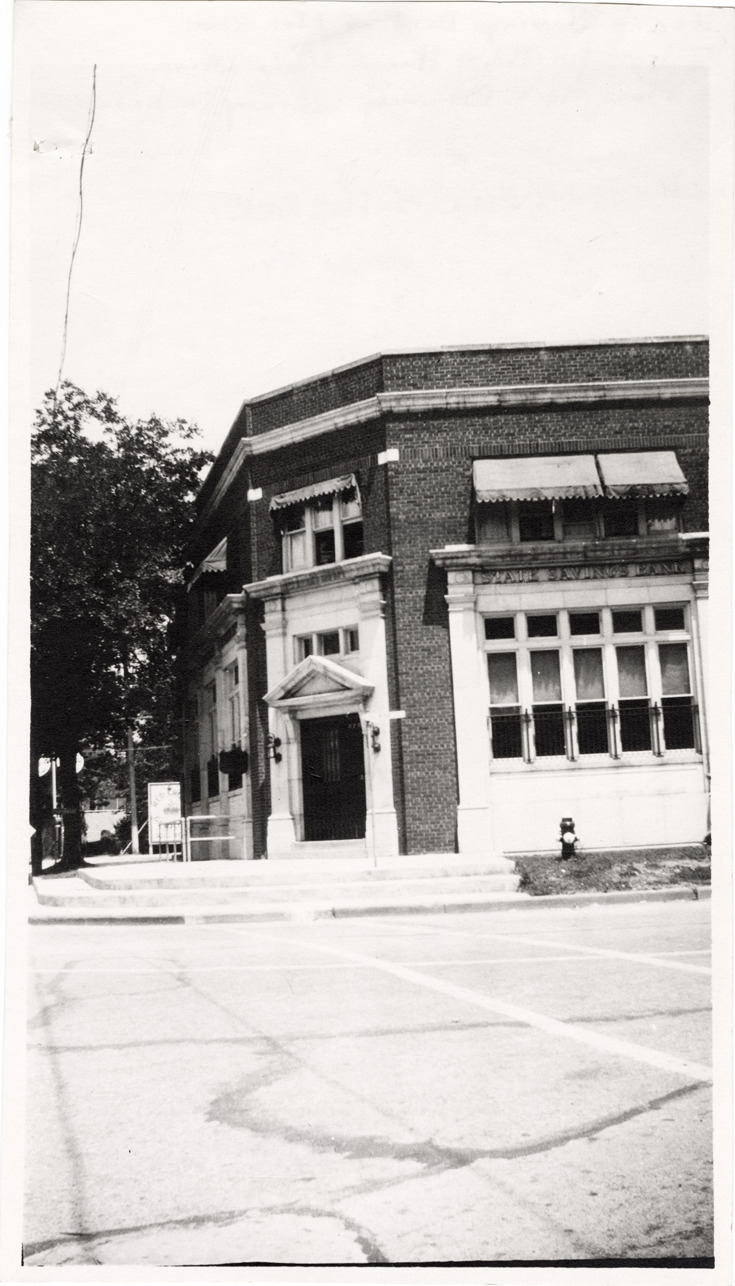 View of the Flat Rock Center, Wayne County Service, Detroit Public Library housed in the basement of the State Savings Bank. Handwritten on back: "State Savings Bank of Flat Rock. Telegraph Rd. & Huron River Drive. Flat Rock Branch Library in basement."