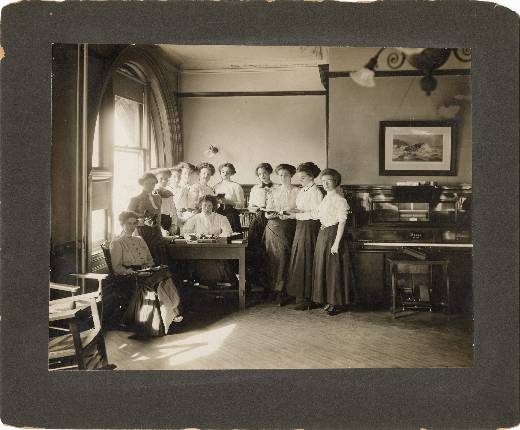 View of women workers posing in the library station located at the Michigan State Telephone Co. Stations were administered by the Extension Dept. of the Detroit Public Library. Librarian sits at desk; piano on right. Stamped on back: "C.C. Brewe, com'l photographer, 205 Griswold St., Detroit, Mich. general viewing, copying, developing and printing for amateurs." Handwritten on back: "Music room and library. Michigan State Telephone Co., Detroit Public Library branch. Library patrons at Michigan State Telephone Co. office."