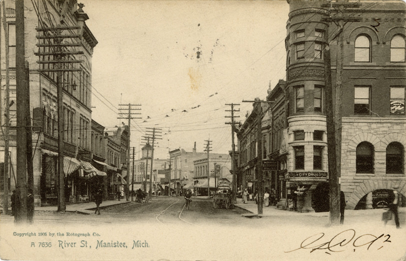View of commercial buildings on River St., Manistee, Michigan. Printed on front: "A 7636 River St., Manistee, Mich. Copyright 1905 by the Rotograph Co." Printed on back: "The Rotograph Co., N.Y., City, (Germany)." Card is postmarked October 30, 1905.