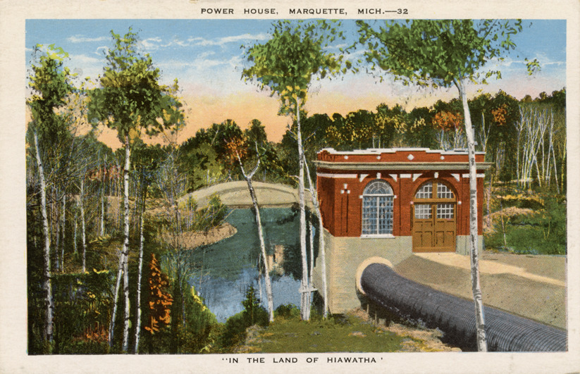 View of the power plant in Marquette, Michigan. Printed on front: "Power house, Marquette, Mich. In the land of Hiawatha." Printed on back: "Made in U.S.A. by E.C. Kropp Co., Milwaukee, Wis."