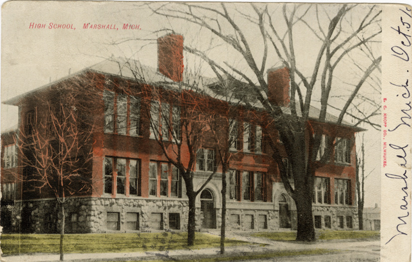 View of the High School in Marshall, Michigan. Printed on front: "High School, Marshall, Mich. E.C. Kropp Co., Milwaukee." Handwritten on front: "Marshall, Mich. Oct. 5." Handwritten message on back, partially covered by label. Card is postmarked October 6, 1907.