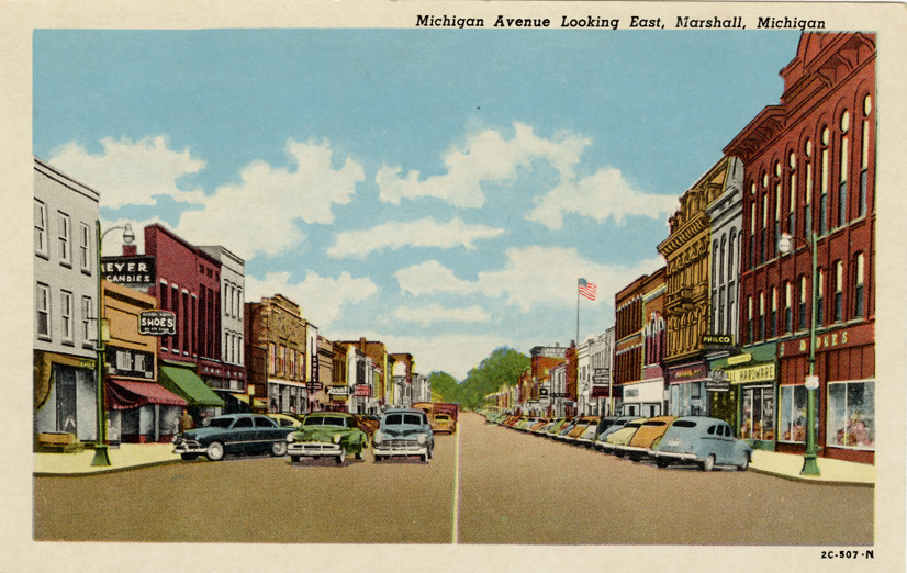 View of commercial buildings and cars on Michigan Ave. in Marshall, Michigan. Printed on front: "Michigan Avenue looking east, Marshall, Michigan." Printed on back: "Hemmingsen Drug Store, Marshall, Mich. Genuine Curteich-Chicago 'C.T. American Art' post card (reg. U.S. Pat. Off.)"