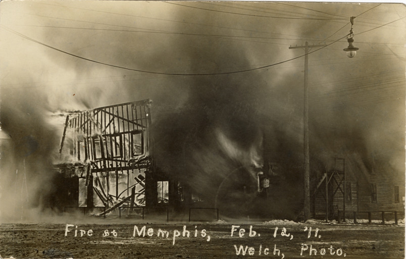 View of a commercial building on fire in Memphis, Michigan. Printed on front: "Fire at Memphis, Feb. 12, '11. Welch, photo." Handwritten on back: "2/15/1911, Dear Bro., This a picture of fire Sunday morning that burned entire block from hardware to Bernsteam store. Harry saved everything but damaged covered by insurance. All well, RH Jones." Card is postmarked February 16, 1911.