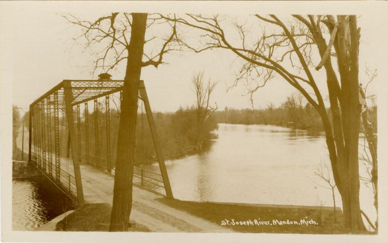 Favorite this☆ Bridge over the St. Joseph River, Mendon, Michigan Description: View of a bridge over the St. Joseph River in Mendon, Michigan. Printed on front: "St. Joseph River, Mendon, Mich." Details Resource ID: bh021008 Subject: Iron and steel bridges--Michigan--Mendon Saint Joseph River (Mich. and Ind.) Rivers--Michigan--Mendon Photographic prints Postcards Date Issued: Unknown year Format: 1 postcard ; 3.5 x 5.5 in. Member of: Burton Historical Collection Filing Location: M/Localities-Mendon Rights: Physical rights are retained by DPL. Copyright is retained in accordance with U.S. copyright laws.