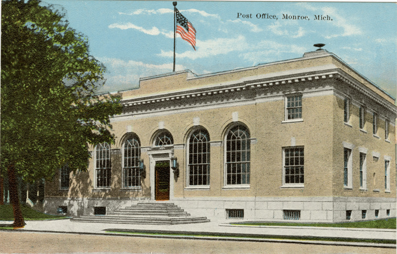 Favorite this☆ U.S. Post Office, Monroe, Michigan Description: View of the U.S. Post Office in Monroe, Michigan. Printed on front: "Post Office, Monroe, Mich." Printed on back: "Pub. by F.L.A. Mitchell." Details Resource ID: bh021049 Subject: Post office buildings--Michigan--Monroe Postcards Publisher: F.L.A. Mitchell Date Issued: Unknown year Format: 1 postcard : col. ; 3.5 x 5.5 in. Member of: Burton Historical Collection Filing Location: M/Localities-Monroe Rights: Physical rights are retained by DPL. Copyright is retained in accordance with U.S. copyright laws.