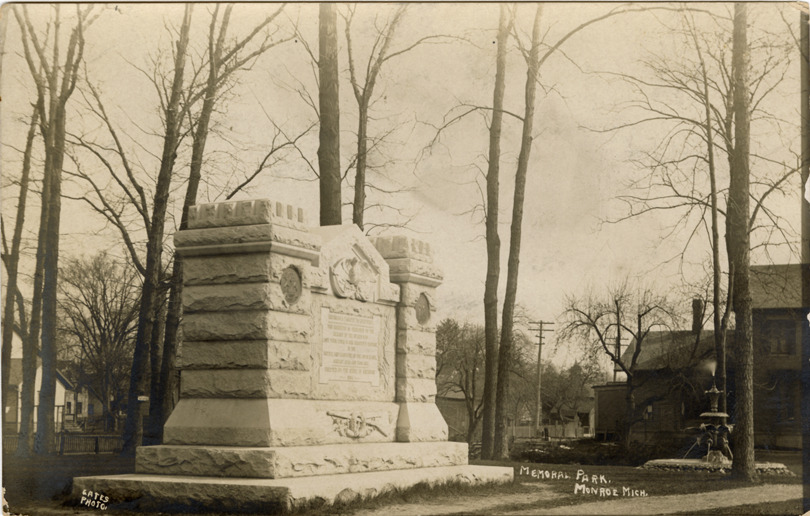 View of a monument to Kentucky soldiers killed during the Battle of River Raisin in Monroe, Michigan. Printed on front: "Memorial Park, Monroe, Mich. Gates, photo."