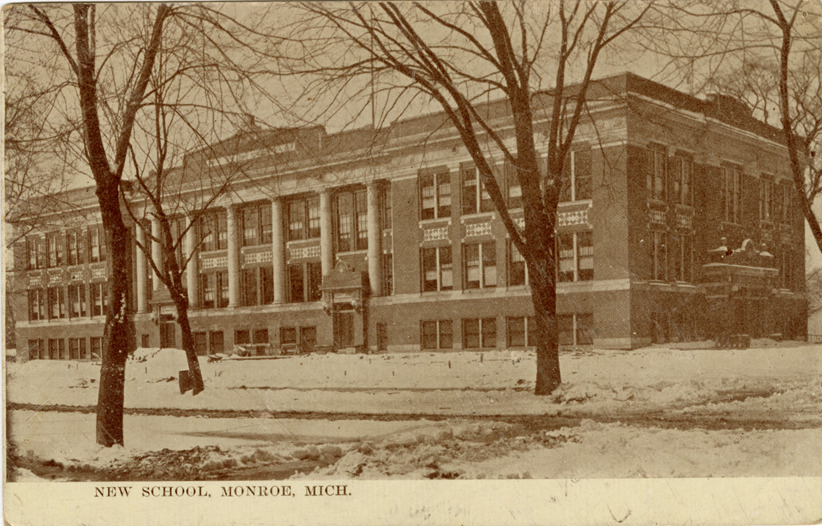 Favorite this☆ High School, Monroe, Michigan Description: View of the High School in Monroe, Michigan. Printed on front: "New School, Monroe, Mich." Foreign language message handwritten on back. Card is postmarked June 26, 1913. Details Resource ID: bh021093 Subject: High school buildings--Michigan--Monroe Postcards Date Issued: 1913 (year approximate) Format: 1 postcard ; 3.5 x 5.5 in. Member of: Burton Historical Collection Filing Location: M/Localities-Monroe Rights: Physical rights are retained by DPL. Copyright is retained in accordance with U.S. copyright laws.