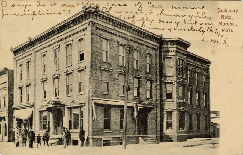 View of the Saulsbury Hotel in Morenci, Michigan. Printed on front: "Saulsbury Hotel, Morenci, Mich." Handwritten on front: "O say, is it another case of 'so many prescriptions'? Of course, I know you're awfully busy but you know your duty. Ha! Ha. L.M.S." Card is postmarked September 13, 1907.