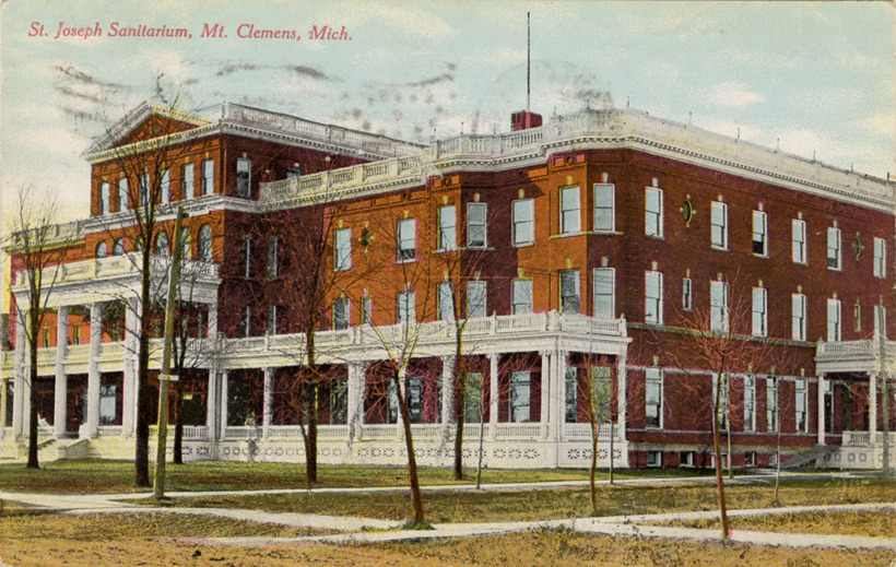 View of the St. Joseph Sanitarium in Mt. Clemens, Michigan. Printed on front: "St. Joseph Sanitarium, Mt. Clemens, Mich." Handwritten on back: "Dear Flora, Am out automobiling with Carl and Josephine am having a great time. Your Uncle Chas." Card is postmarked July 9, 1910.