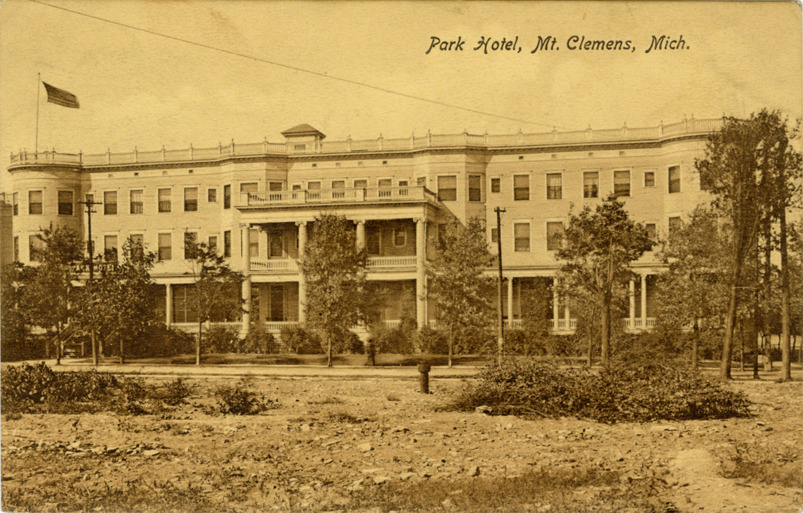 View of the Park Hotel in Mt. Clemens, Michigan. Printed on front: "Park Hotel, Mt. Clemens, Mich." Printed on back: "Pub. by Import Post Card Co., Indianapolis, Ind. and Leipzig. Made in Germany." Handwritten on back: "Arrived here O.K. Will be home Sunday. Marion." Card is postmarked December 29, 1911.