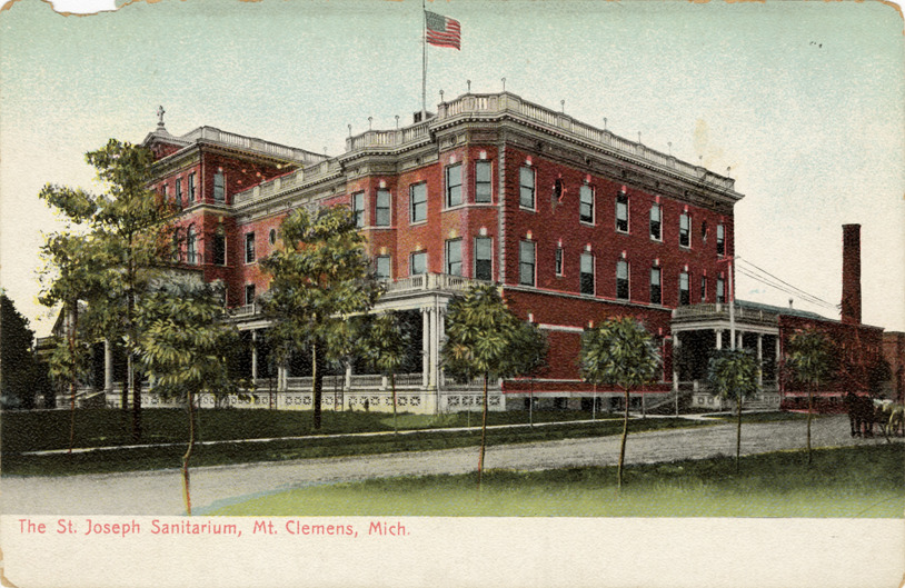 Favorite this☆ St. Joseph Sanitarium, Mount Clemens, Michigan Description: View of the St. Joseph Sanitarium in Mt. Clemens, Michigan. Printed on front: "The St. Joseph Sanitarium, Mt. Clemens, Mich." Printed on back: "Made in Germany." Details Resource ID: bh021145 Subject: Sanatoriums--Michigan--Mount Clemens Postcards Date Issued: Unknown year Format: 1 postcard : col. ; 3.5 x 5.5 in. Member of: Burton Historical Collection Filing Location: M/Localities-Mt. Clemens Rights: Physical rights are retained by DPL. Copyright is retained in accordance with U.S. copyright laws.