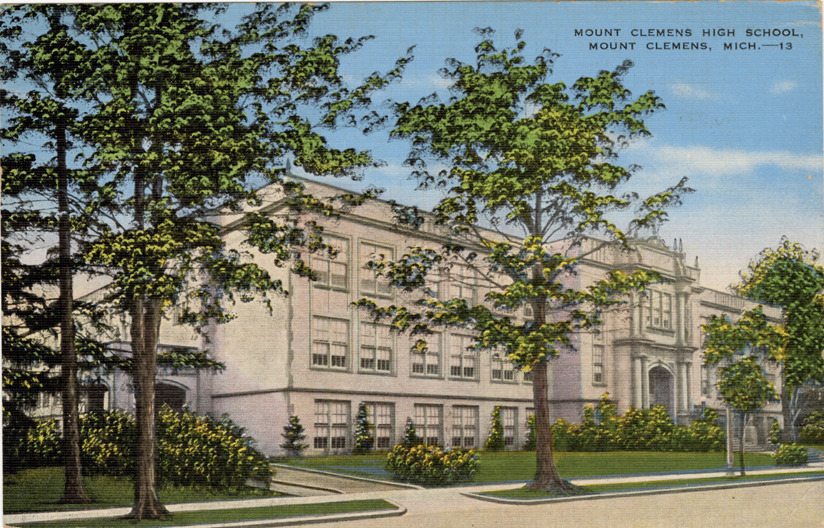 View of Mount Clemens High School in Mt. Clemens, Michigan. Printed on front: "Mount Clemens High School, Mt. Clemens, Mich." Printed on back: "Mount Clemens High School, with an enrollment of 1100 pupils, is a part of one of the most modern educational systems in Michigan. Natural color postcard made in U.S.A. by E.C. Kropp Co., Milwaukee, Wis. (HKF)." Handwritten on back: "Dear Bessie, Hope you are enjoying better health. We are both fine & having a good time. Here for a few days. Expect to be home sometime next week. Happy New Year to all. Julia." Card is postmarked January 1, 1944.