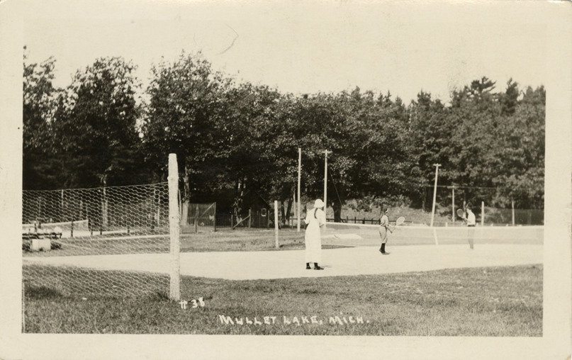 View of tennis players on court at Mullett Lake, in Cheboygan County, Michigan. Printed on front: "Mullet Lake, Mich." Handwritten on back: "Having a fine rest." Card is postmarked August 19.