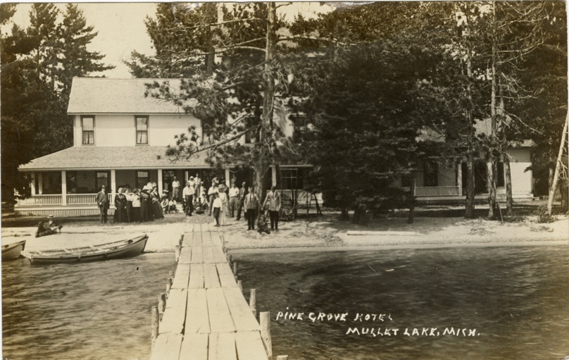 View of guests posing in front of the Pine Grove Hotel at Mullett Lake, in Cheboygan County, Michigan. Dock in foreground. Printed on front: "Pine Grove Hotel, Mullet Lake, Mich." Handwritten on back: "Am having one fine time. Will write you as soon as I can find a minute. Love [undecipherable]." Card is postmarked August 8, 1912.