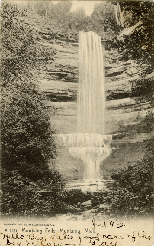 View of Munising Falls at Munising, Michigan. Printed on front: "A 7561. Munising Falls, Munising, Mich. Copyright 1905 by the Rotograph Co." Handwritten on front: "Jul. 9th. Hello Bea, Take good care of the big fellow, Grace." Printed on back: "The Rotograph Co., N.Y., City, (Germany)." Card is postmarked July 19, 1907.