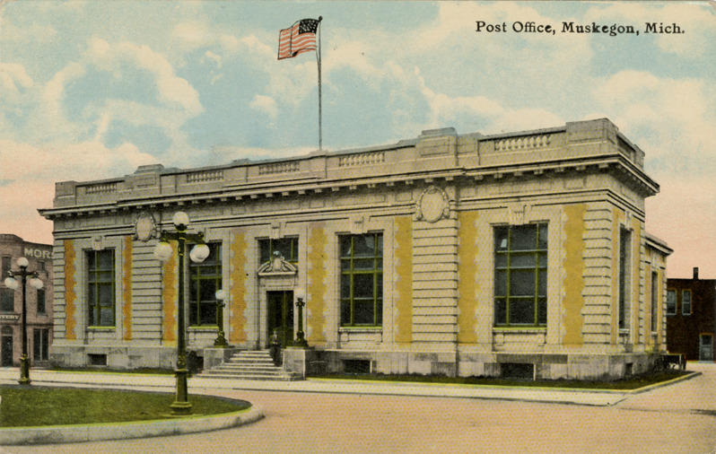 View of the U.S. Post Office in Muskegon, Michigan. Printed on front: "Post Office, Muskegon, Mich." Printed on back: "Published expressly for S.H. Knox & Co. Made in U.S.A." Handwritten on back: "From Forrest DeCan."