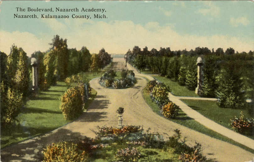 Favorite this☆ Boulevard, Nazareth Academy, Nazareth, Michigan Description: View of the Boulevard at Nazareth Academy, Nazareth, Michigan. Printed on front: "The Boulevard, Nazareth Academy, Nazareth, Kalamazoo County, Mich." Printed on back: "Published by the Nazarene Co., Nazareth, Mich. Made in U.S.A." Details Resource ID: bh021263 Subject: Streets--Michigan--Nazareth Catholic schools--Michigan--Nazareth Single-sex schools--Michigan--Nazareth Postcards Publisher: Nazarene Co. Date Issued: Unknown year Format: 1 postcard : col. ; 3.5 x 5.5 in. Member of: Burton Historical Collection Filing Location: M/Localities-Nazareth Rights: Physical rights are retained by DPL. Copyright is retained in accordance with U.S. copyright laws.