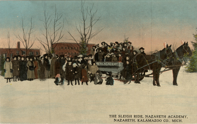 View of girls posing with horse-drawn sleigh in the snow, Nazareth Academy, Nazareth, Michigan. Printed on front: "The sleigh ride, Barbour Hall, Nazareth, Kalamazoo Co., Mich." Printed on back: "Hermann Post Card Co., 217 Pine St., St. Louis, Mo."