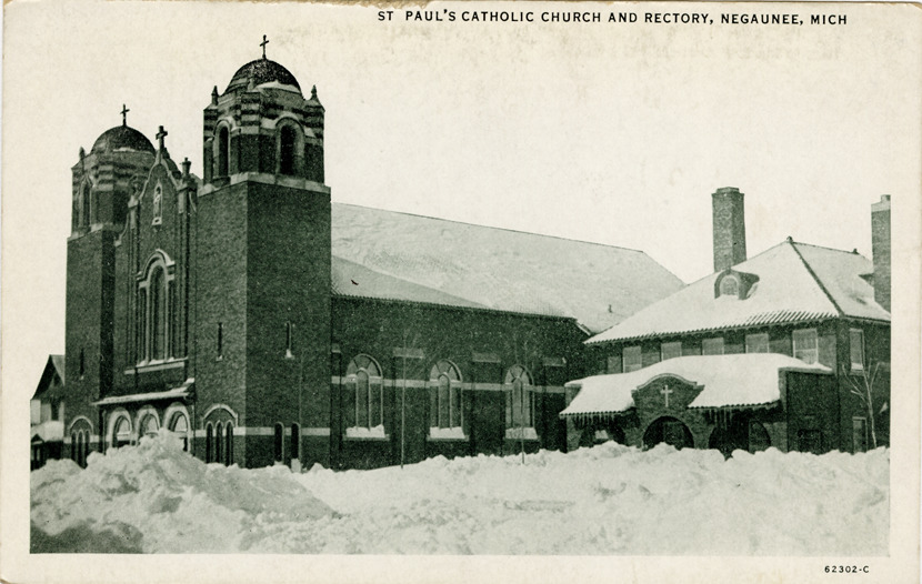 View of St. Paul's Catholic Church and rectory in Negaunee, Michigan. Printed on front: "St. Paul's Catholic Church and rectory, Negaunee, Mich." Printed on back: "C.T. Photo-Finish. Made only by Curt Teich & Co., Inc., Chicago, U.S.A."