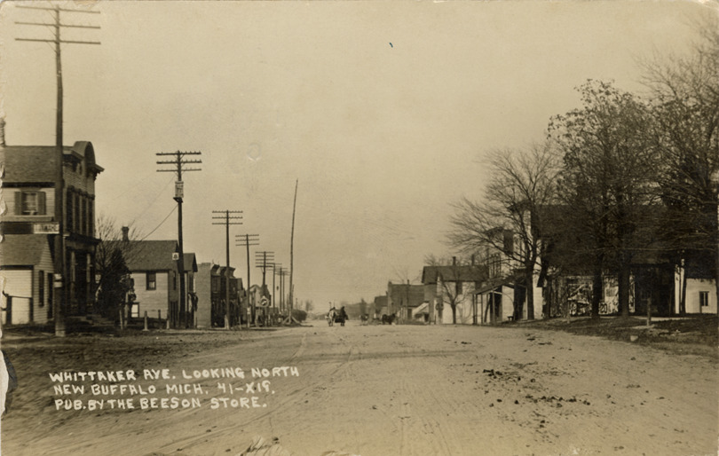 View of commercial buildings on Whittaker Ave. in New Buffalo, Michigan. Printed on front: "Whittaker Ave. looking north, New Buffalo, Mich. 41-X19. Pub. by the Beeson Store." Printed on back: "Schmidt, the druggist. New Buffalo, Mich." Foreign language message handwritten on back. Card is postmarked September 7, 1909.