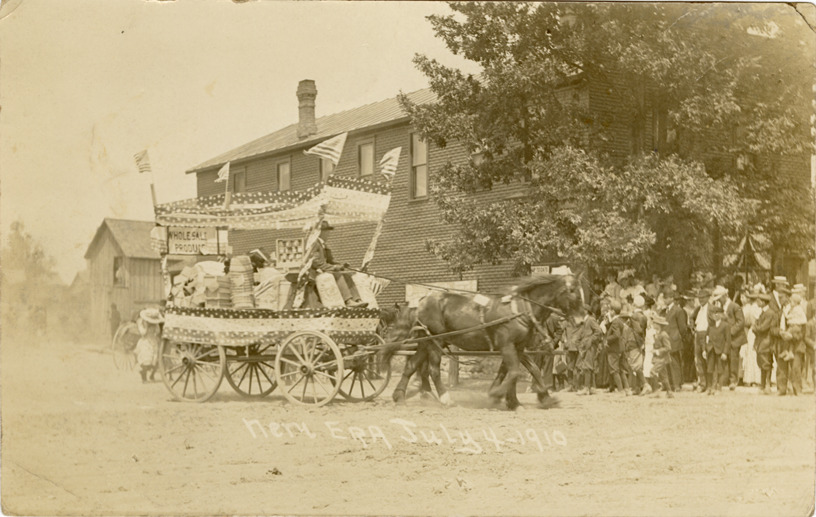 View of a man driving a horse-drawn wagon decorated for the 4th of July. Group of onlookers on right; commercial building in background. Printed on front: "New Era, July 4, 1910." Handwritten on back: "Aug 7, 1910. Dear [undecipherable] as it is nearing your birth day I will drop this sample little token. Mother. Hope you both are all well we are not so very well [undecipherable] poorly [undecipherable] is ded [sic] an old neighbor gon [sic] where we all soon shall bee [sic]. I have known her [undecipherable] years a good neighbor [undecipherable] Tuesday afternoon."