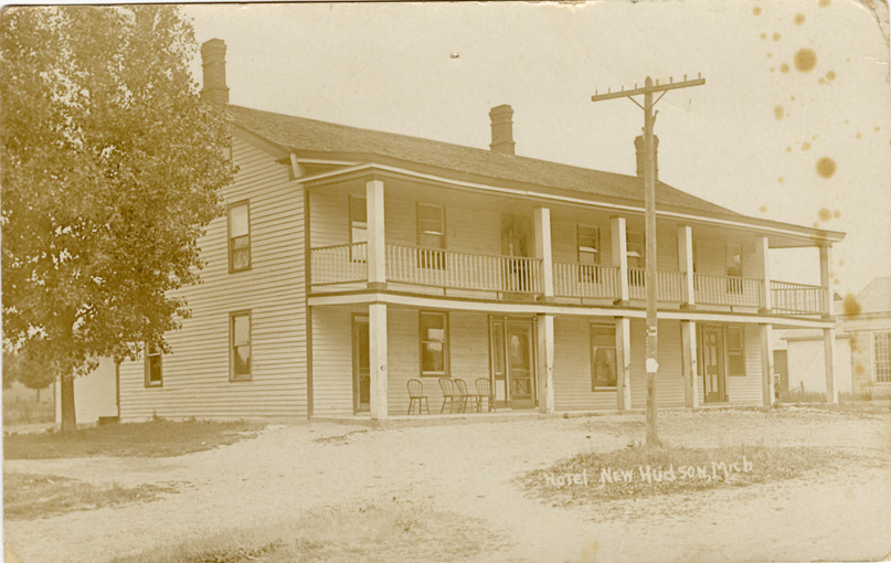View of a two-story, wooden-frame hotel in New Hudson, Michigan. Printed on front: "Hotel, New Hudson, Mich." Printed on back: "Glenn E. Killins, South Lyon, Mich." Handwritten on back: "New Hudson, Mich. July 19th, 1908. Dear Brother, You will likely reconise [sic] an old landmark it looks as well as it did 30 years ago. All well. Owen Gallagher."