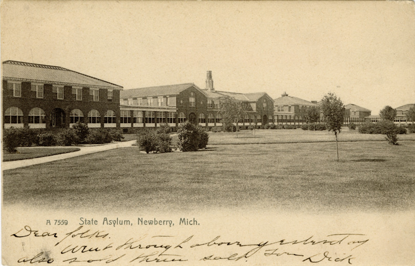 View of the Upper Peninsula Hospital for the Insane in Newberry, Michigan. Printed on front: "A 7559. State Asylum, Newberry, Mich." Handwritten on front: "Dear Folks, Went through above yesterday. Also sold [undecipherable]. From, Dick." Printed on back: "The Rotograph Co., N.Y., City, (Germany)." Card is postmarked March 15, 1906.
