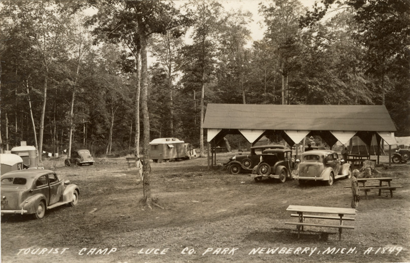 View of camping trailers, cars and picnic tables at the Luce County Park in Newberry, Michigan. Printed on front: "Tourist camp, Luce Co. Park, Newberry, Mich." Handwritten on back: "This is where we are camping now even farther up north but no good fishing or swimming. We climbed Sugar Mountain and saw Pictured Rocks. The weather is good. Love, [undecipherable]." Card is postmarked August 7, 1940.