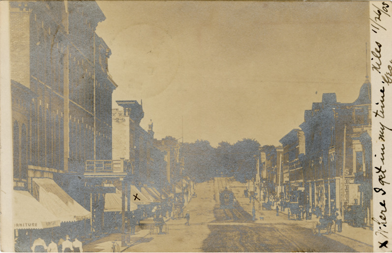Favorite this☆ Street, Niles, Michigan Description: View of commercial buildings on an unidentified street in Niles, Michigan. Streetcar in background. Handwritten on front: "X where I get in my time. Geo. Niles, 11/26/05." Details Resource ID: bh021325 Subject: Streets--Michigan--Niles Commercial buildings--Michigan--Niles Photographic prints Postcards Date Issued: 1905 (year approximate) Format: 1 postcard ; 3.5 x 5.5 in. Member of: Burton Historical Collection Filing Location: M/Localities-Niles Rights: Physical rights are retained by DPL. Copyright is retained in accordance with U.S. copyright laws.