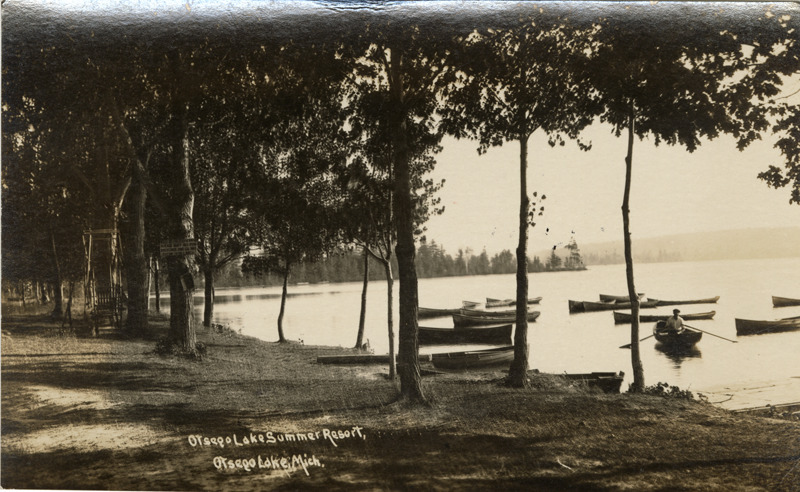 View of boats near shoreline at Kennedy's Summer Resort at Otsego Lake, Michigan. Man rows boat on right. Printed on front: "Otsego Lake Summer Resort, Otsego Lake, Mich."
