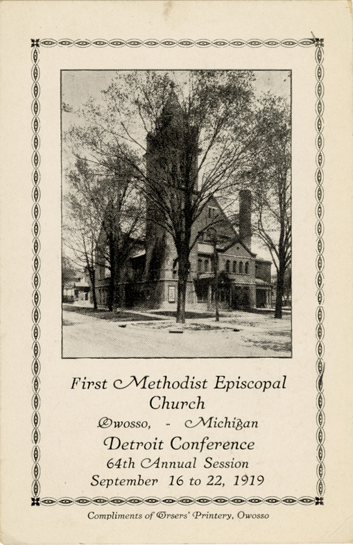View of the First Methodist Episcopal Church in Owosso, Michigan. Printed on front: "First Methodist Episcopal Church, Owosso, Michigan. Detroit Conference, 64th Annual Session. September 16 to 22, 1919. Compliments of Orsers' Printery, Owosso."