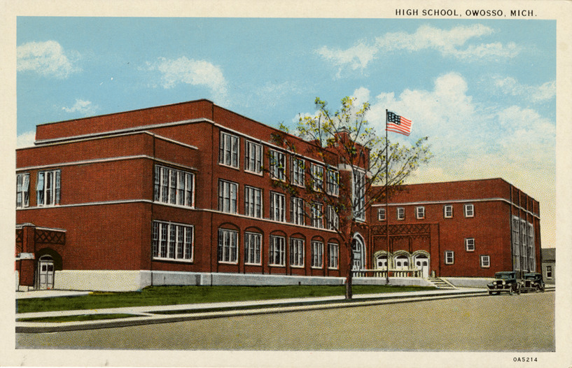 Favorite this☆ High School, Owosso, Michigan Description: View of the High School in Owosso, Michigan. Printed on front: "High School, Owosso, Mich." Printed on back: "Published by Crane News Agency, Owosso, Mich. C.T. American Art Colored. CT Co., Chicago." Details Resource ID: bh021365 Subject: High school buildings--Michigan--Owosso Postcards Publisher: Crane News Agency Curt Teich & Co. Date Issued: Unknown year Format: 1 postcard : col. ; 3.5 x 5.5 in. Member of: Burton Historical Collection Filing Location: M/Localities-Owosso Rights: Physical rights are retained by DPL. Copyright is retained in accordance with U.S. copyright laws.