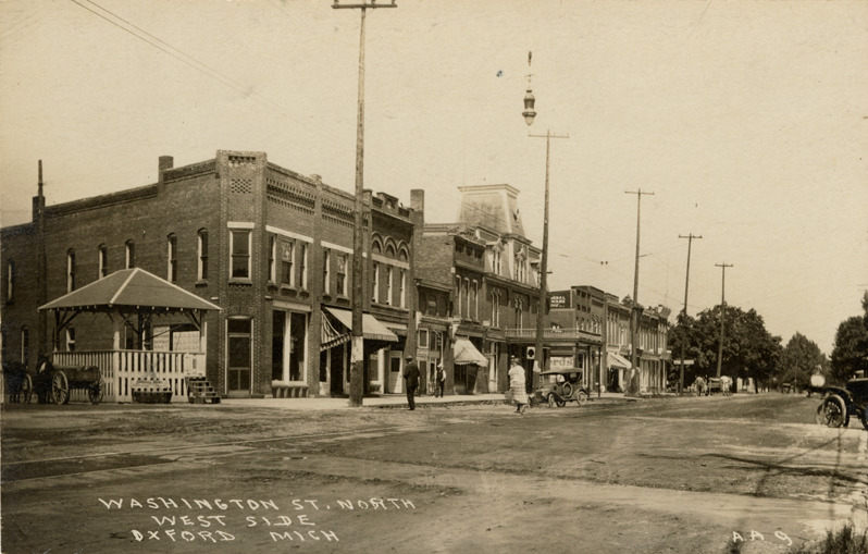 Favorite this☆ Washington Street, Oxford, Michigan Description: View of commercial buildings on Washington St. in Oxford, Michigan. Bandstand on corner. Printed on front: "Washington St. North, west side, Oxford, Mich." Card is postmarked July 20, 1920. Details Resource ID: bh021391 Subject: Streets--Michigan--Oxford Commercial buildings--Michigan--Oxford Bandstands--Michigan--Oxford Photographic prints Postcards Date Issued: 1920 (year approximate) Format: 1 postcard ; 3.5 x 5.5 in. Member of: Burton Historical Collection Filing Location: M/Localities-Oxford Rights: Physical rights are retained by DPL. Copyright is retained in accordance with U.S. copyright laws.