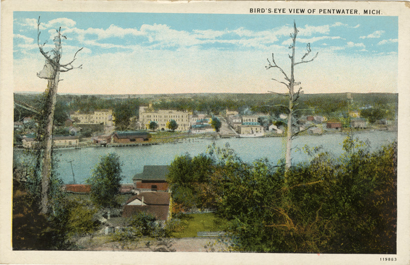 Favorite this☆ Aerial view of Pentwater, Michigan Description: Bird's-eye view of Pentwater, Michigan, showing river and buildings. Printed on front: "Bird's-eye view of Pentwater, Mich." Printed on back: "Published by Bradford & Co., St. Joseph, Mich. C.T. American Art Colored. CT Co., Chicago." Details Resource ID: bh021407 Subject: Pentwater (Mich.)--Aerial views Rivers--Michigan--Pentwater Waterfronts--Michigan--Pentwater Postcards Publisher: Bradford & Co. Curt Teich & Co. Date Issued: Unknown year Format: 1 postcard : col. ; 3.5 x 5.5 in. Member of: Burton Historical Collection Filing Location: M/Localities-Pentwater Rights: Physical rights are retained by DPL. Copyright is retained in accordance with U.S. copyright laws.