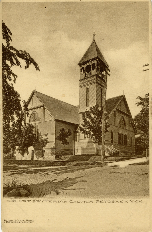 View of the First Presbyterian Church in Petoskey, Michigan. Printed on front: "No. 364. Presbyterian Church, Petoskey, Mich. Alton G. Cook, publ. Petoskey, Mich." Handwritten on back: "7/24/11. Dear Mother, I received your postal today. Saturday I wrote a letter home. Everything is all right but the thermometer is about 42 [degrees]. Gee! It's cold. I will stay for the 3rd section. Mable Wetherbee will mail this. Affectionately, Ed. [undecipherable]." Card is postmarked July 24, 1911.