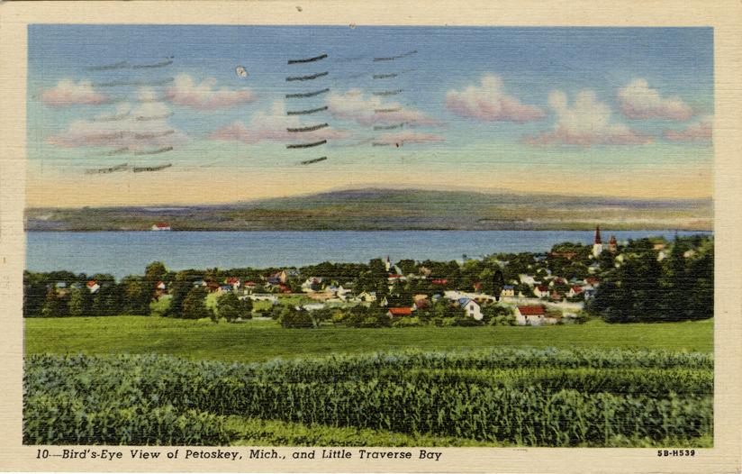 Bird's-eye view of Petoskey, Michigan and Little Traverse Bay. Printed on front: "10. Bird's-eye view of Petoskey, Mich., and Little Traverse Bay." Printed on back: "Mrs. C.C. Graham, Petoskey, Mich. Genuine Curteich-Chicago 'C.T. Art-Colortone' post card (reg. U.S. Pat. Off.)" Handwritten on back [in part]: " ... here from the Straits to get a cabin by 4 p.m. The best ones are snapped up early. We've had all kinds of accomodations, even slept in a trailer one nite. Saw Rita Hayworth tonite - boy- she's still good! Bern."