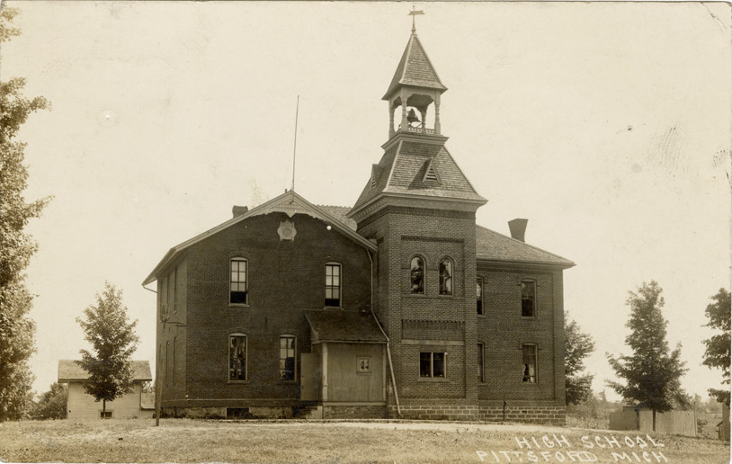 View of the High School in Pittsford, Michigan. Printed on front: "High School, Pittsford, Mich." Handwritten on back: "Pittsford, Aug. 28, 1918. Dear Cousins, Got home all right found Addie waiting for us. The train was some late. We stopped with [undecipherable] overnight found her able to be around the house but is quite poorly. It is looking dark this morning and beginning to rain. We were very sorry to hear of the sad accident of your sister and baby but were glad to hear that Angie was not hurt so badly as we heard at first. Addie talked with Clarence on the phone last night. We are all well and getting rested."