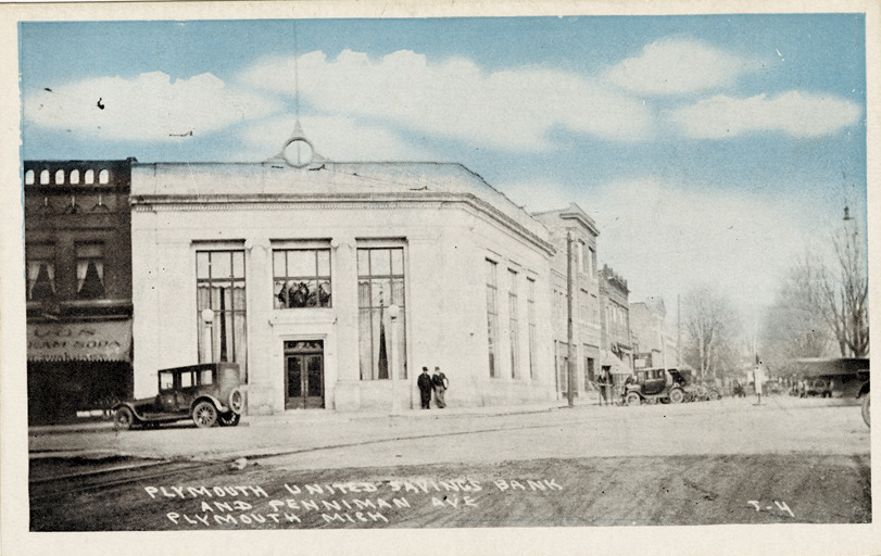 View of the Plymouth United Savings Bank on Penniman Avenue in Plymouth, Michigan. Cars in street. Printed on front: "Plymouth United Savings Bank and Penniman Ave., Plymouth, Mich." Printed on back: "Auburn Post Card Mfg. Co., Auburn, Inc. Made in U.S.A."