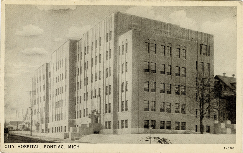 Favorite this☆ City Hospital, Pontiac, Michigan Description: View of City Hospital in Pontiac, Michigan. Printed on front: "City Hospital, Pontiac, Mich." Printed on back: "Pub. by Ludington News Co., Detroit, Mich. Mfg. by Fort Wayne Printing Co., Fort Wayne, Ind." Details Resource ID: bh021486 Subject: Hospital buildings--Michigan--Pontiac Postcards Publisher: Ludington News Co. Date Issued: Unknown year Format: 1 postcard ; 3.5 x 5.5 in. Member of: Burton Historical Collection Filing Location: M/Localities-Pontiac Rights: Physical rights are retained by DPL. Copyright is retained in accordance with U.S. copyright laws.
