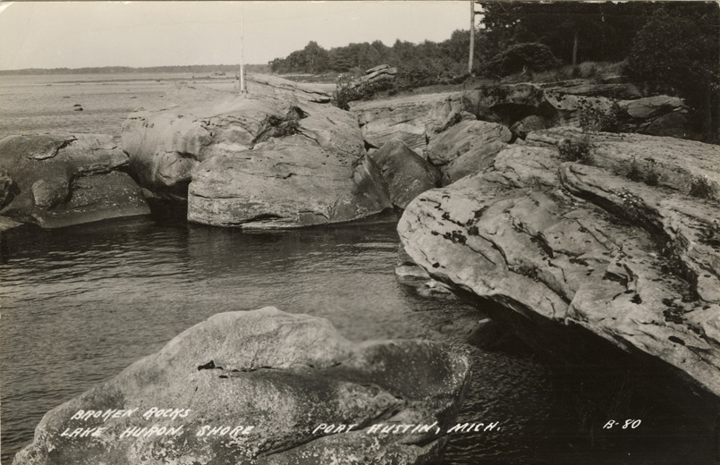 View of Broken Rocks, Lake Huron shore in Port Austin, Michigan. Printed on front: "Broken rocks, Lake Huron shore, Port Austin, Mich." Printed on back: "All rights reserved. The L.L. Cook Co., Milwaukee."