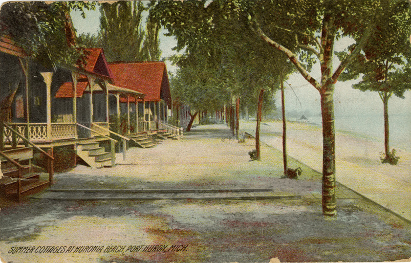 View of cottages on Huronia Beach at Port Huron, Michigan. Printed on front: "Summer cottages at Huronia Beach, Port Huron, Mich." Printed on back: "The Rotograph Co., N.Y., City. Printed in Germany." Undecipherable handwritten message on back. Card is postmarked September 9, 1908.