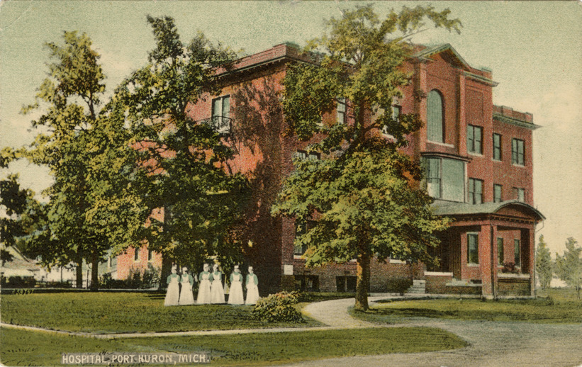 View of the hospital in Port Huron, Michigan. Printed on front: "Hospital, Port Huron, Mich." Printed on back: "Published by W. Sylvester, Port Huron, Mich. No. 30954. Made in Germany." Handwritten on back: "We're here all Saturday night. Helen & [undecipherable]." Card is postmarked June 27, 1915.