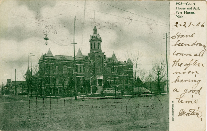 View of the courthouse and jail in Port Huron, Michigan. Printed on front: "5928. Court house and jail, Port Huron, Mich. Souvenir Post Card Co., N.Y." Handwritten on front: "2-21-06. Have been downtown all the afternoon. Having a good time [undecipherable]."
