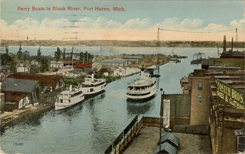 View of ferries on the Black River in Port Huron, Michigan. Printed on front: "Ferry boats in Black River, Port Huron, Mich." Printed on back: "Valentine-Souvenir Co., New York." Handwritten message on back is partially covered by label. Card is postmarked 1914.
