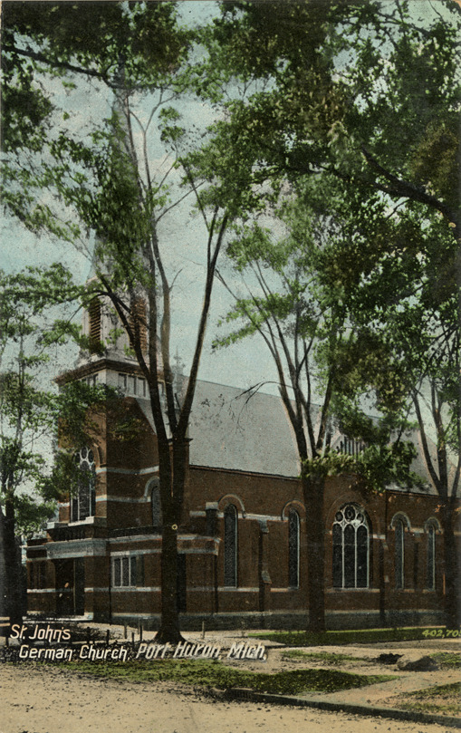 Favorite this☆ St. John's German Church, Port Huron, Michigan Description: View of St. John's German Church in Port Huron, Michigan. Printed on front: "St. John's German Church, Port Huron, Mich." Printed on back: "The Valentine & Sons' Publishing Co., Ltd., New York. Printed in Great Britain." Details Resource ID: bh021579 Subject: Church buildings--Michigan--Port Huron Postcards Publisher: Valentine & Son's Publishing Co. Date Issued: Unknown year Format: 1 postcard : col. ; 5.5 x 3.5 in. Member of: Burton Historical Collection Filing Location: M/Localities-Port Huron Rights: Physical rights are retained by DPL. Copyright is retained in accordance with U.S. copyright laws.