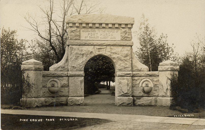View of stone gate at Pine Grove Park in Port Huron, Michigan. Inscribed on gate: "Bequeathed to the people of Port Huron by Charles Albert Ward." Printed on front: "Pine Grove Park, Pt Huron. Pesha, photo."