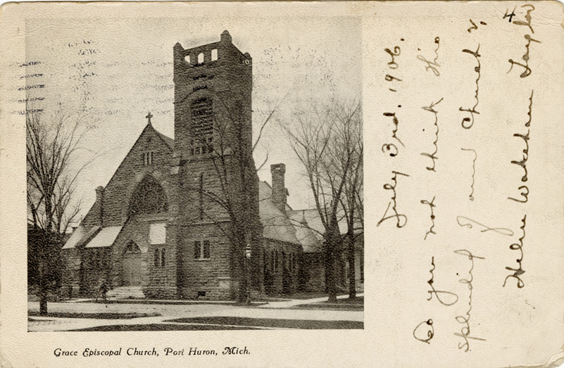View of Grace Episcopal Church in Port Huron, Michigan. Printed on front: "Grace Episcopal Church, Port Huron, Mich." Handwritten on front: "July 3, 1906. Do you not think this splendid of our church? Helen Wakeham Taylor." Printed on back: "J. Murray Jordan, publisher. 1438 So. Penn Sq., Philadelphia." Card is postmarked July 3, 1906.